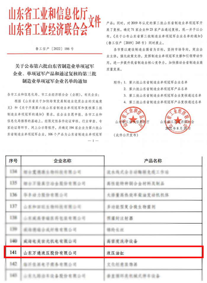 近日,山東萬(wàn)通液壓股份有限公司收到《山東省工業(yè)和信息化廳、山東省工業(yè)經(jīng)濟聯(lián)合會(huì )關(guān)于公布第六批山東省制造業(yè)單項冠軍企業(yè)、單項冠軍產(chǎn)品和通過(guò)復核的第三批制造業(yè)單項冠軍企業(yè)名單的通知》(魯工信產(chǎn)﹝2022﹞186號),公司入選第六批山東省制造業(yè)單項冠軍企業(yè)。