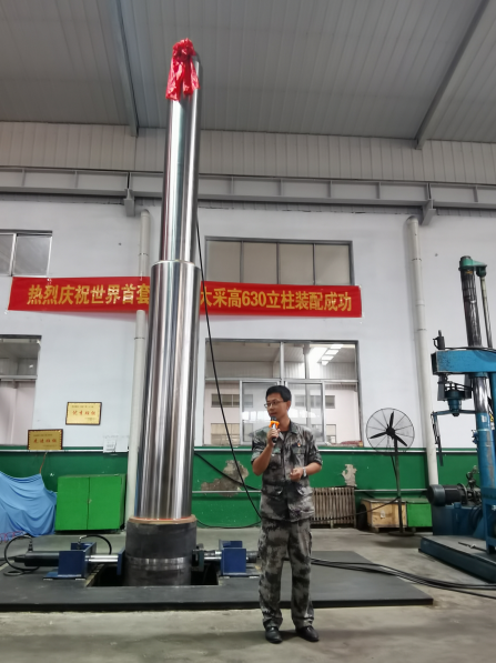 公司研發(fā)出超大10米采高液壓支架抗腐蝕性超大直徑長(cháng)行程雙級630立柱油缸,填補了國內空白,其為ZY29000/45/100D兩柱掩護式液壓支架做配套,最高支護高度10米,單機重量超120噸。作為本套支架的核心部件,該立柱一級缸徑630mm,單重8.8噸,閉合高度3970mm,伸出高度9320mm,總行程5350mm,工作阻力14500KN。